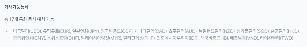 - 출장 등으로 여러 국가를 잦은 빈도로 방문한다면 17개 통화 모두를 자주 확인할 필요가 있습니다. 환율 변동이 큰 통화에 대해서는 원하는 환율 자동환전 서비스를 적극 활용하면 예상치 못한 손실을 줄일 수 있습니다.