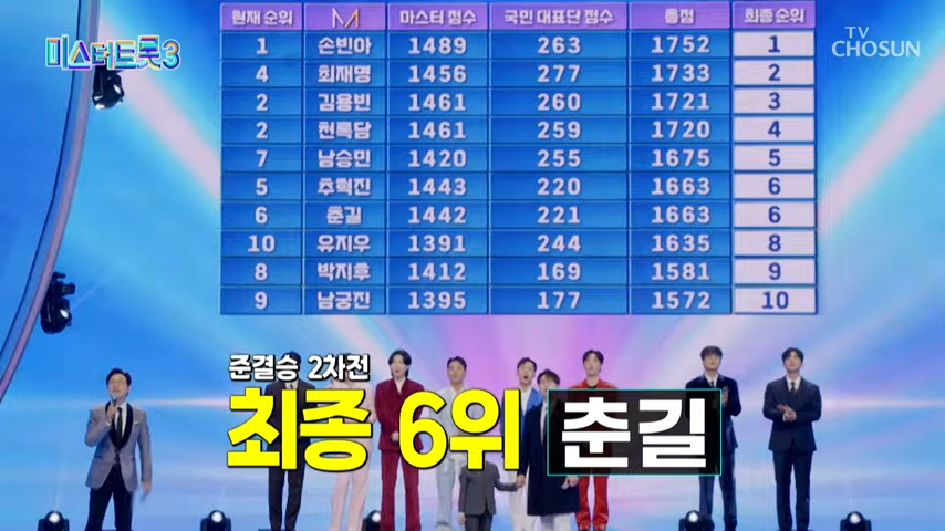 미스터트롯3 결승진출자 명단 TOP7 3월 6일 방송된 준결승 2차전에서 마스터 점수(1500점)와 국민 대표단 점수(300점)를 합산한 총 1800점 만점으로 순위가 결정되었으며, 결승에 진출할 TOP7이 발표되었다. 아쉽게도 남궁진, 박지후, 유지우는 탈락하며 결승 진출에 실패했다. 결승에 진출한 TOP7은 손빈아, 최재명, 김용빈, 천록담, 남승민, 추혁진, 춘길이며, 이들은 최종 무대에서 우승을 놓고 경쟁하게 된다.