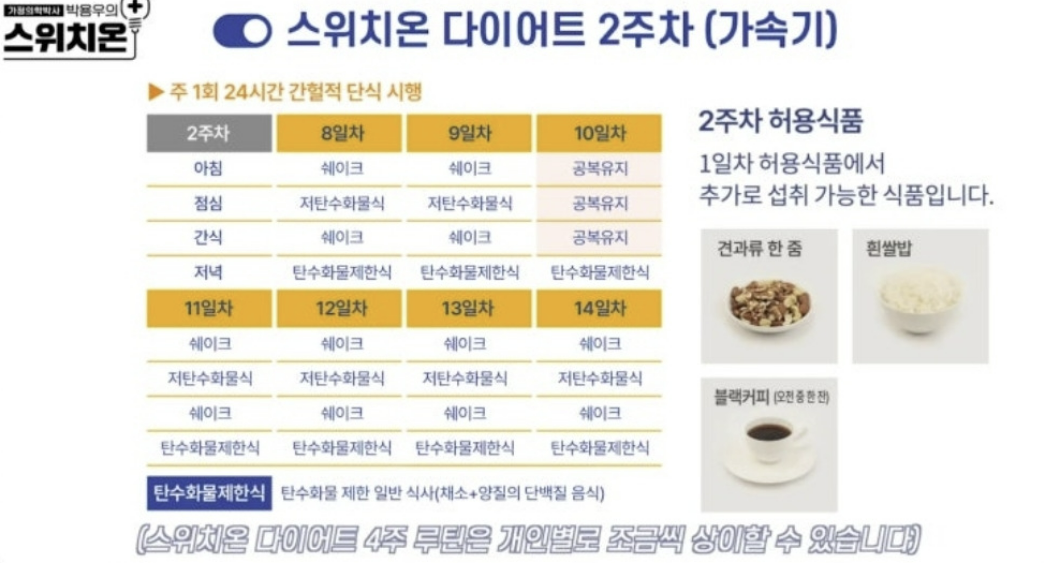 | 2주차 | 아침과 간식: 단백질 쉐이크, 점심: 저탄수화물 식단 (현미밥 1/2공기 + 단백질 + 채소), 저녁: 밥 없이 단백질과 채소 위주의 식단, 주 1회 24시간 단식 실시 |