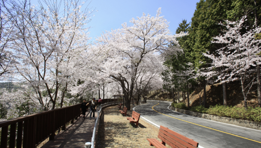 이곳은 단순한 드라이브 코스를 넘어, 야경 명소로도 유명합니다. 해질녘이 되면 벚꽃과 함께 붉게 물든 하늘이 조화를 이루며 장관을 연출하는데요. 정상에는 벤치와 전망대가 마련되어 있어 잠시 차를 세우고 벚꽃과 함께하는 한적한 시간을 보낼 수도 있습니다.