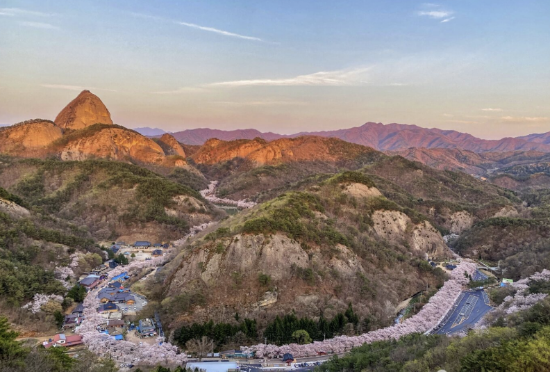 이곳은 단순한 드라이브 코스를 넘어, 야경 명소로도 유명합니다. 해질녘이 되면 벚꽃과 함께 붉게 물든 하늘이 조화를 이루며 장관을 연출하는데요. 정상에는 벤치와 전망대가 마련되어 있어 잠시 차를 세우고 벚꽃과 함께하는 한적한 시간을 보낼 수도 있습니다.