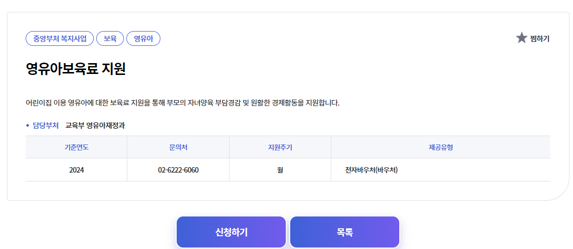 | 어린이집 보육료 | 어린이집 이용 시 정부 지원 보육료 지급 | 복지로 신청 |