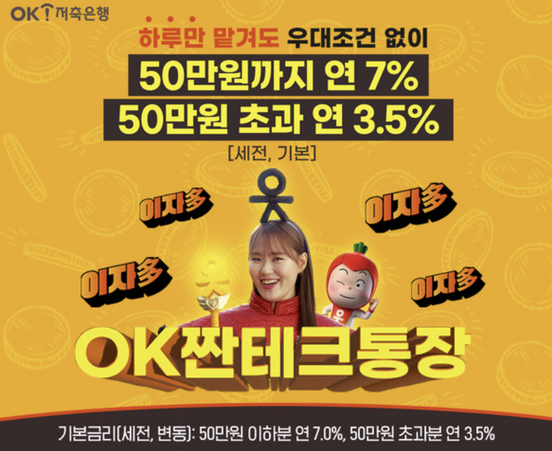 | 1 | OK저축은행 | OK짠테크통장 | 7.0% | 50만 원 이하 | 매월 | 없음 |