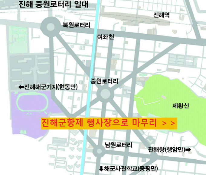 중원로터리는 진해군항제의 중심지로, 이곳에서는 군악대 퍼레이드, 다양한 공연, 플리마켓 등이 열립니다.